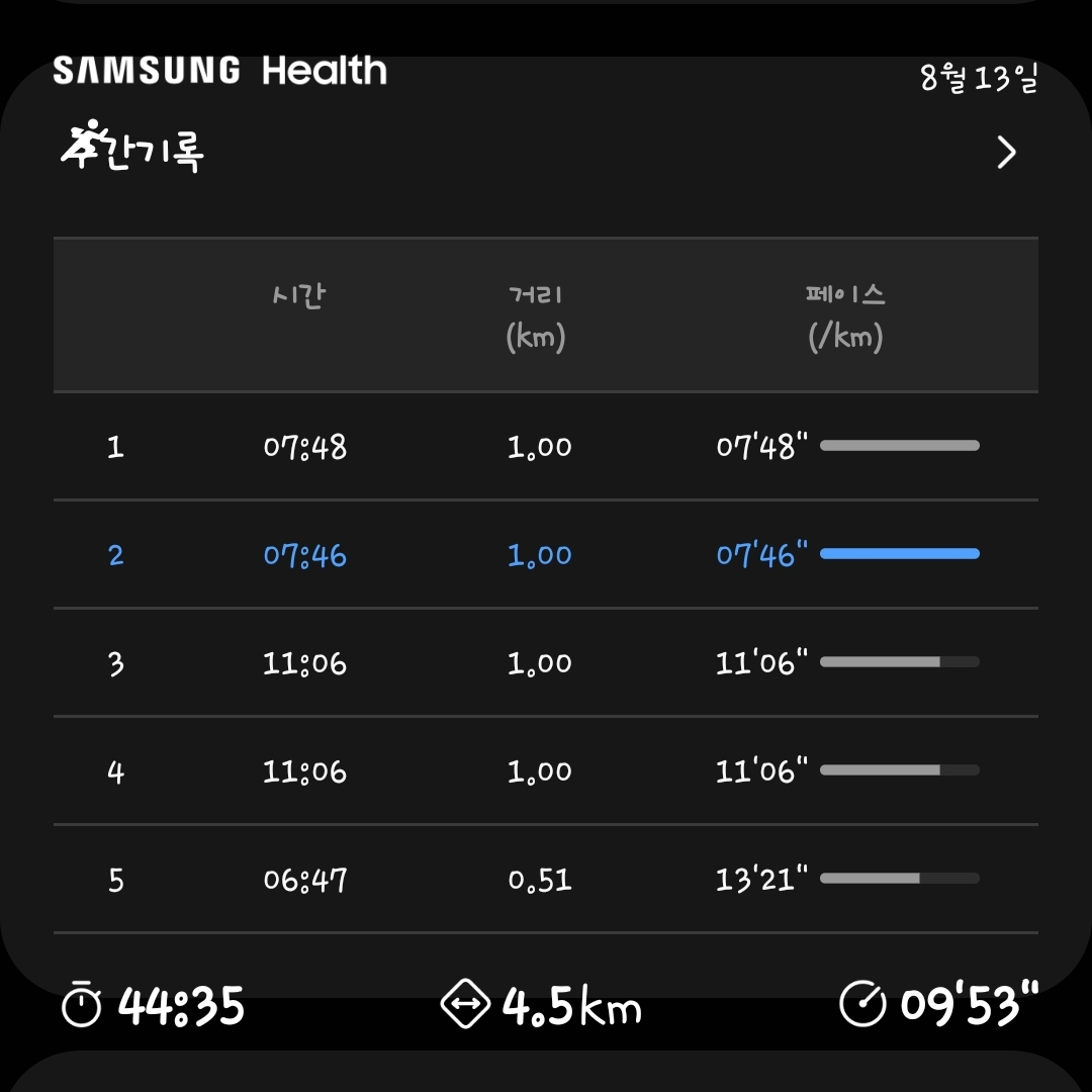 그래도 아버지는 운동을 꾸준히 하셔서 2km는 7분 30초 페이스로 뛰시더라.