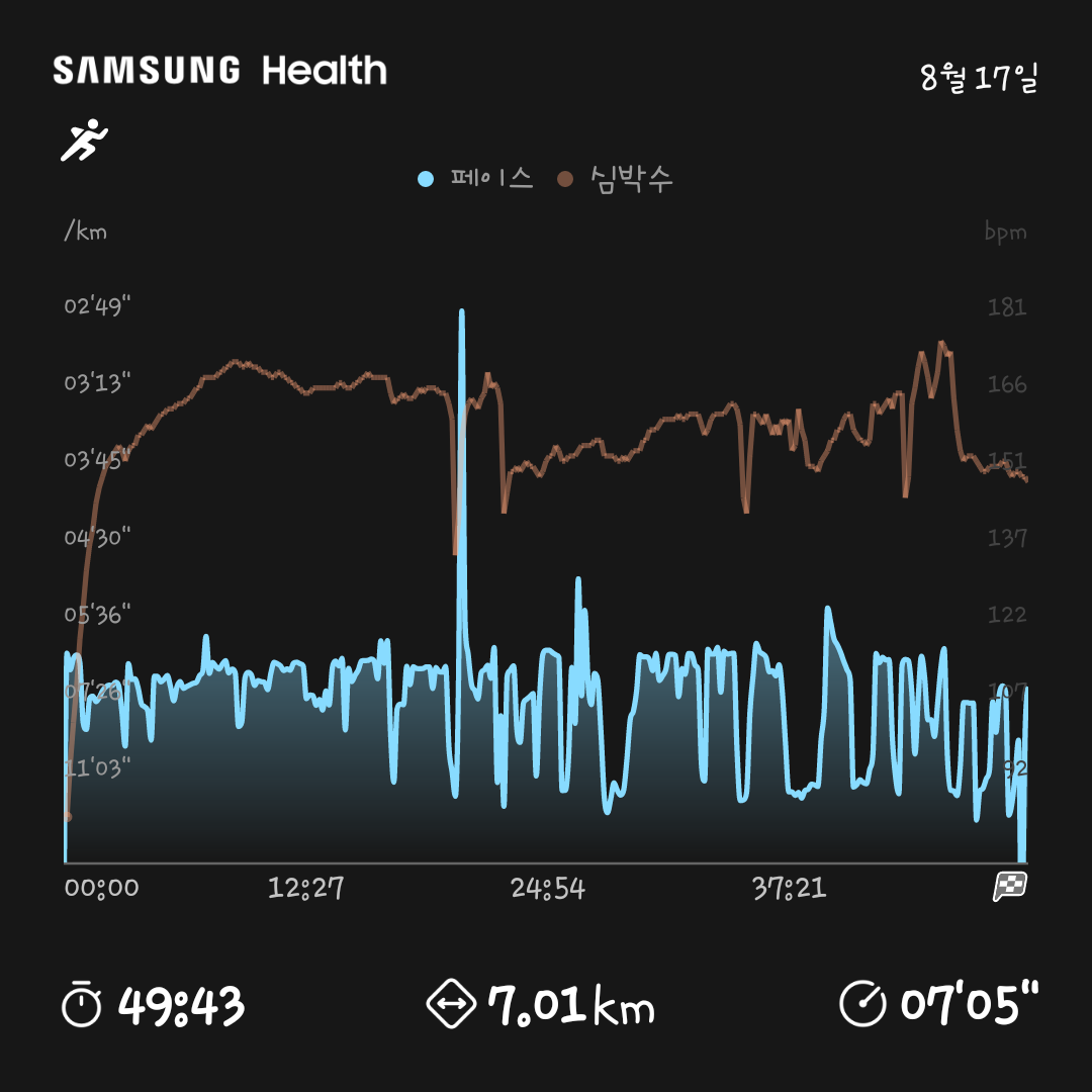 참고로 5일 연속 러닝 중이고 이번주는 5km이하는 딱 한번(등산제외) 뛰었다.