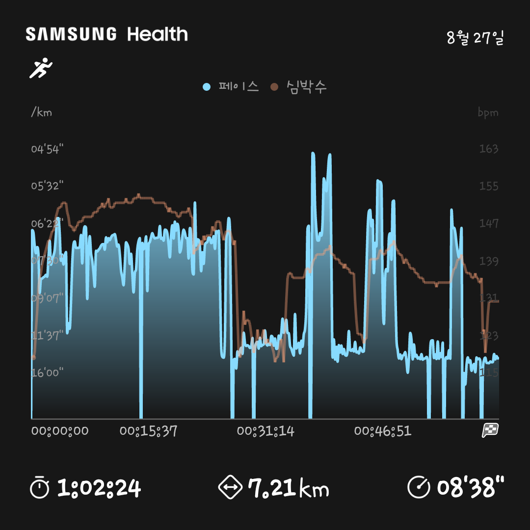 오늘은 아부지와 함께 뛰어서 속도를 내서 뛰지는 않았고 후반에는 거의 걸었다.