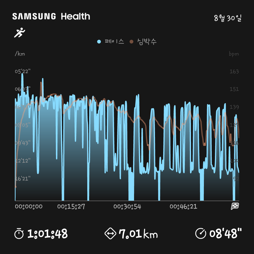 그래서 오늘은 페이스 및 달린 시간이 엉망이다.