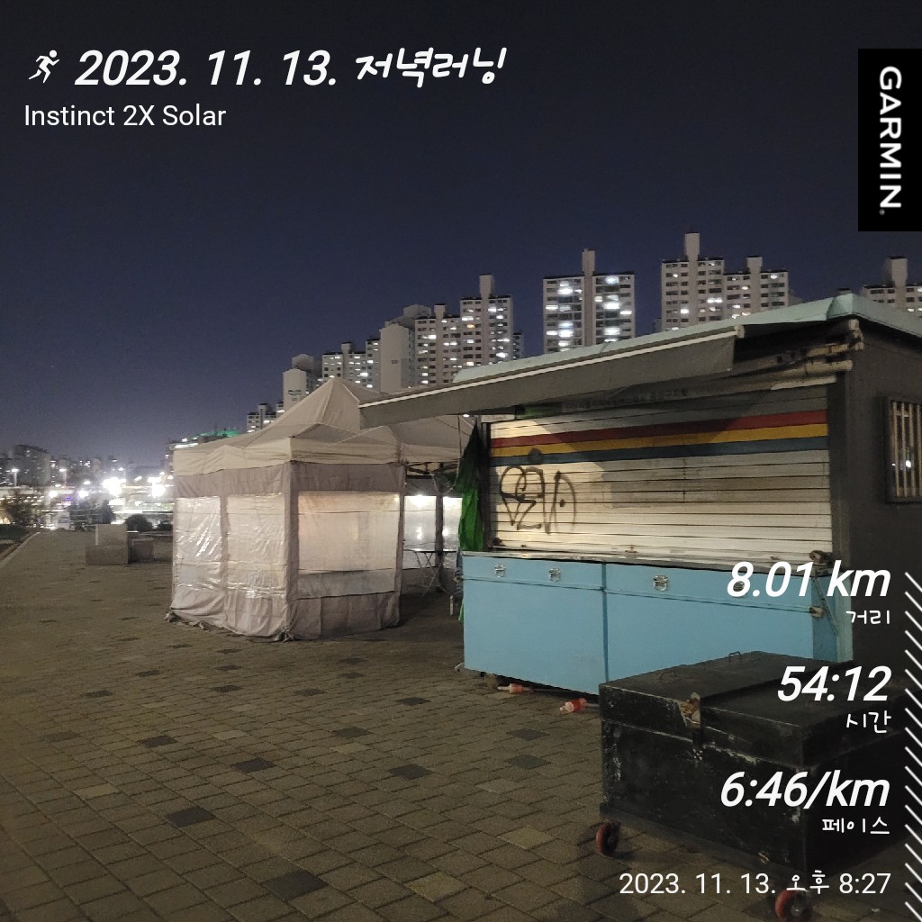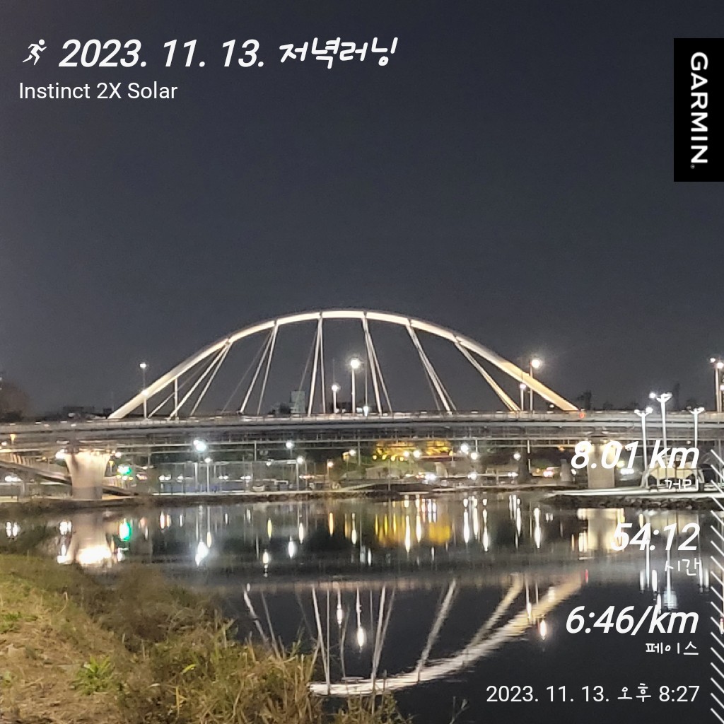 오늘의 러닝 / 묵동천러닝 / 중랑천러닝 / 서울러닝코추천 / 가민인스팅트 2x 솔라 3일차 / 뉴발란스 프레쉬폼 1080 v12 2일차 / 러닝 / 8km러닝 / 2023. 11. 13.