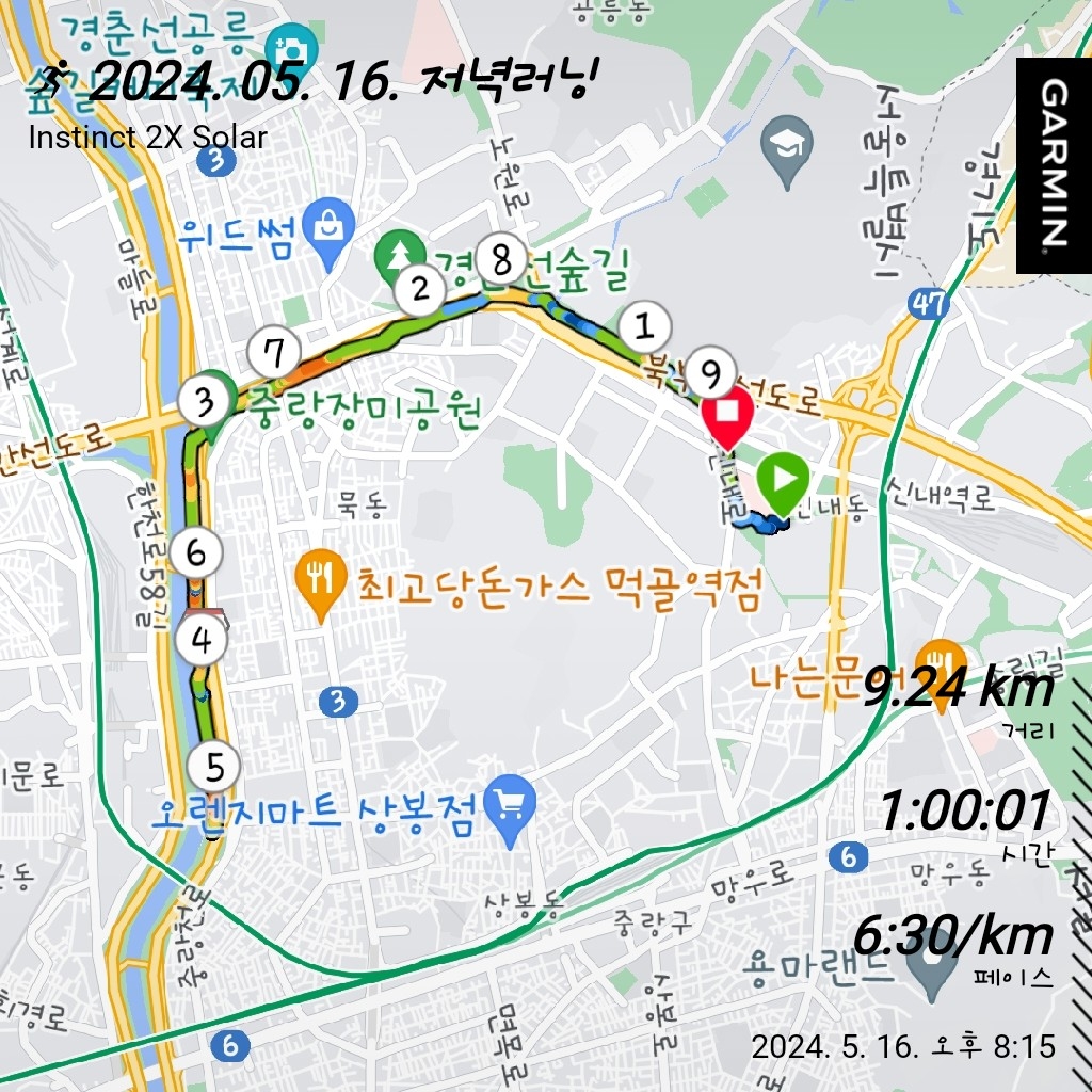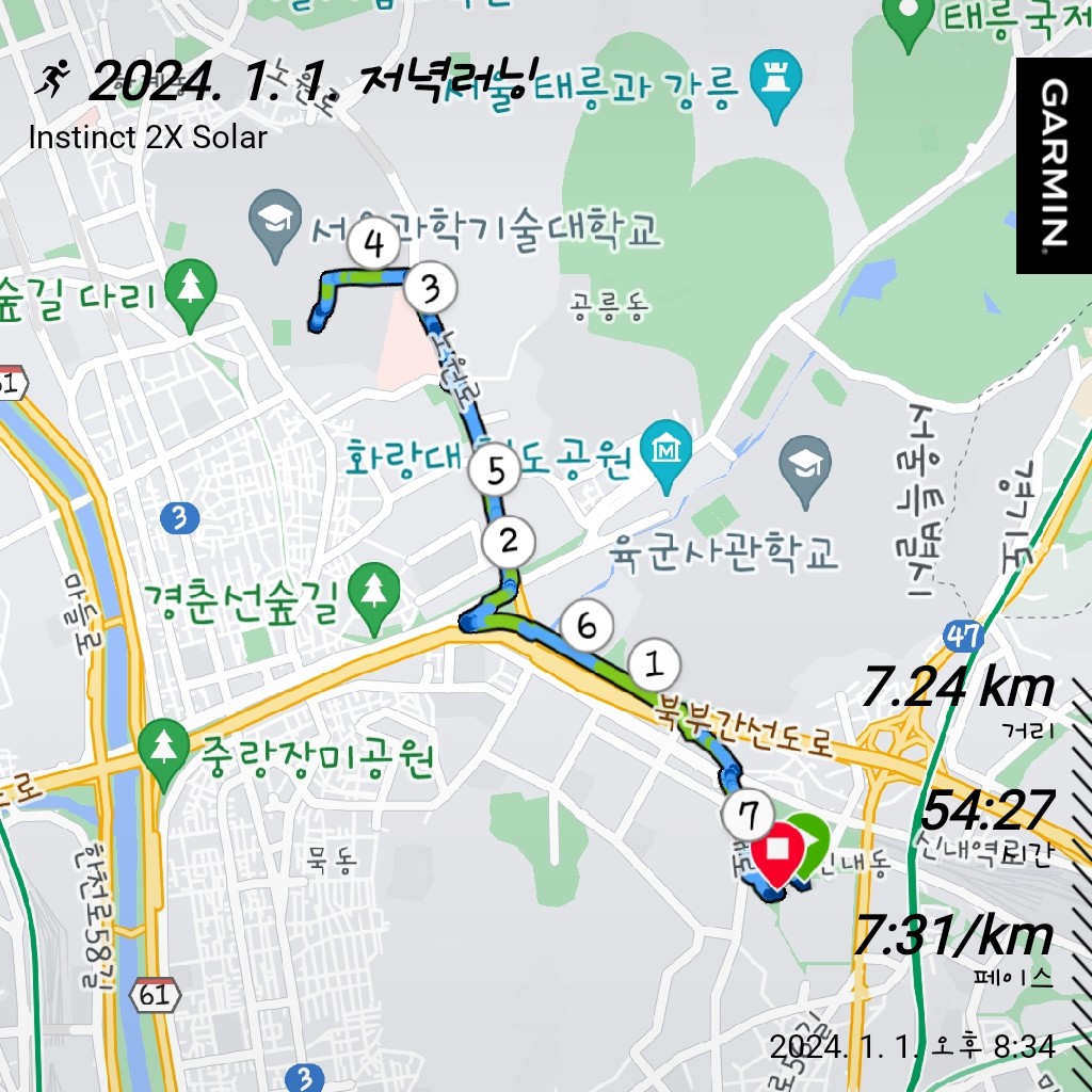 중랑구러닝 / 과기대러닝 / 30분러닝 / 서울러닝코추천 / 서울하프마라톤 준비 / 가민인스팅트 2x 솔라 / 뉴발란스 프레쉬폼 1080 / 러닝 / 7.24km / 2024. 01. 01. / 오늘의 러닝