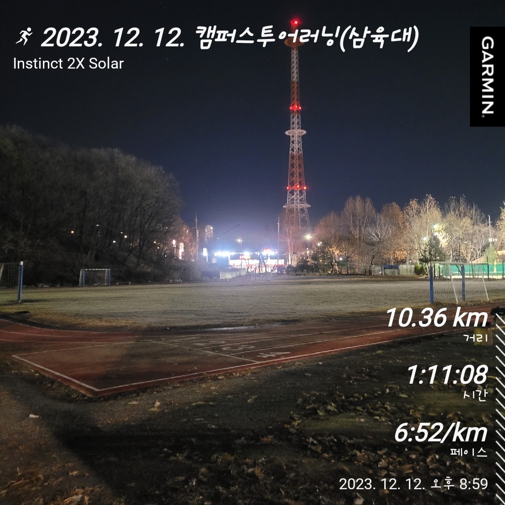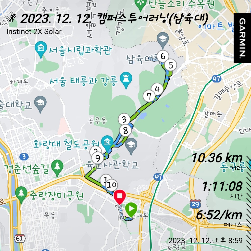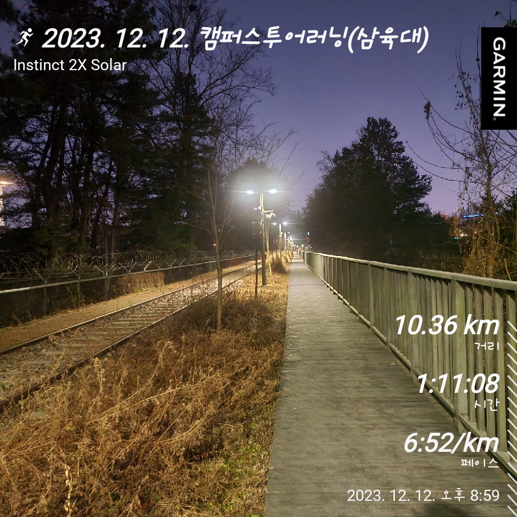 화랑대러닝 / 삼육대러닝 / 경춘선숲길러닝 / 서울러닝코추천 / 대학캠퍼스투어러닝 / 서울하프마라톤 / 가민인스팅트 2x 솔라 / 써코니 액손 3 / 러닝 / 10.36km / 2023. 12. 12. / 오늘의 러닝