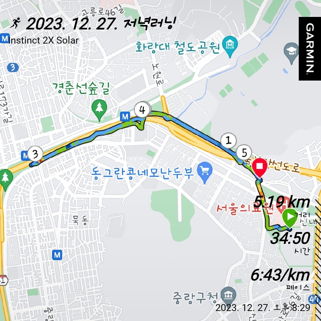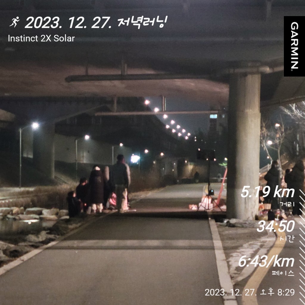 중랑구러닝 / 묵동천러닝 / 30분러닝 / 서울러닝코추천 / 서울하프마라톤 신청 / 가민인스팅트 2x 솔라 / 써코니 액손 3 / 러닝 / 5.19km / 2023. 12. 27. / 오늘의 러닝